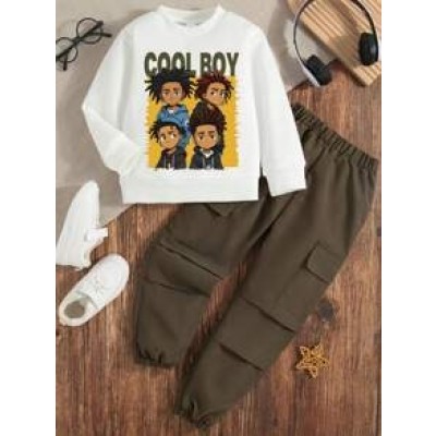 Toddler Letter Print Warm Crew Neck Sweatshirt And Cargo Pants Set